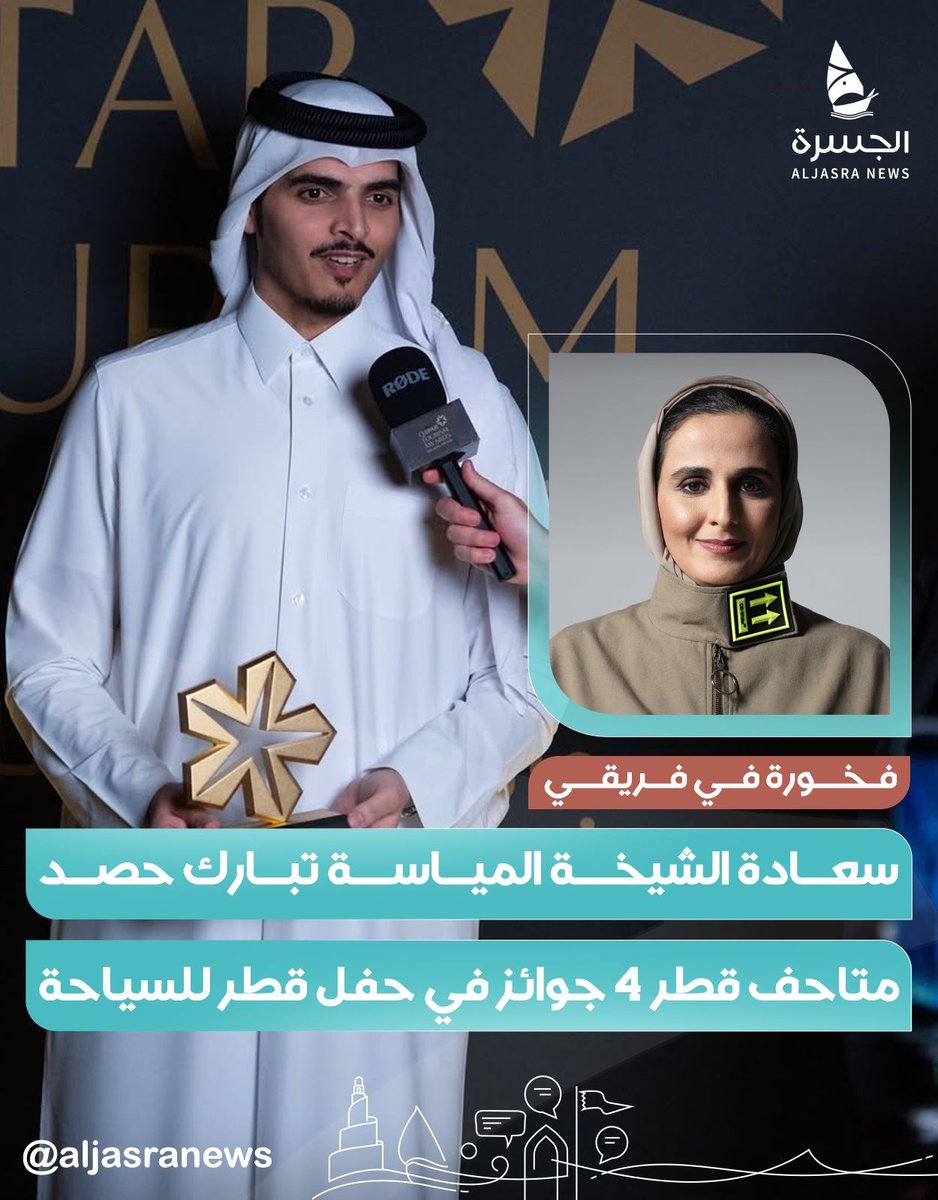 باركت سعادة الشيخة المياسة بنت حمد آل ثاني، رئيس مجلس أمناء متاحف قطر، لفريق عمل المتاحف فوزهم بأربع جوائز مرموقة في حفل قطر للسياحة، معربة عن فخرها واعتزازها بهذا الإنجاز الذي يعكس التميز والجهود المتواصلة التي يبذلها القائمون على القطاع المتحفي
