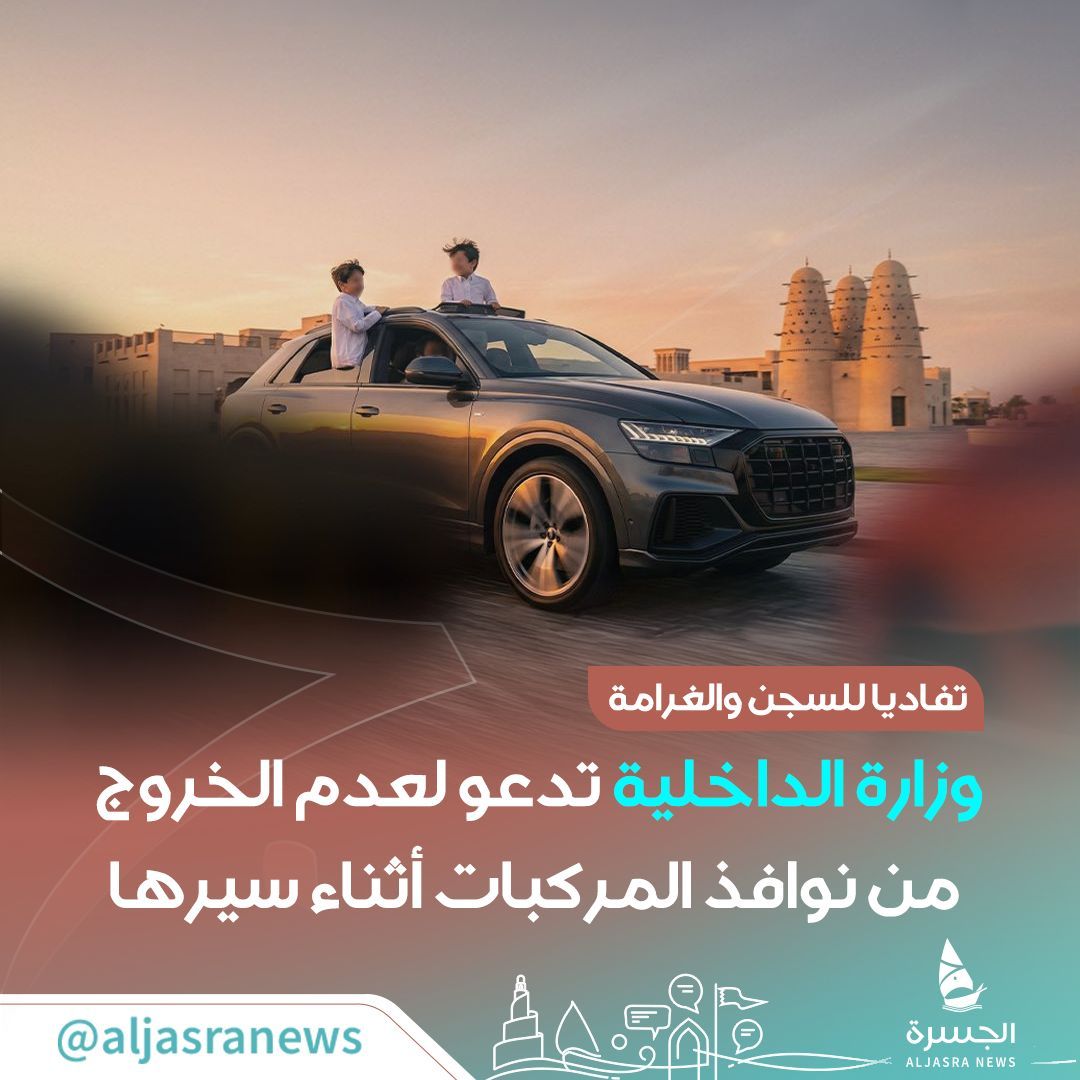 أصدرت وزارة الداخلية تحذيرا شديد اللهجة لكافة قائدي المركبات ومرافقيهم من السلوكيات الخاطئة التي تعرض الأرواح للخطر، وعلى رأسها الجلوس على أسطح المركبات أو الخروج من النوافذ أثناء سيرها في الطرقات العامة.