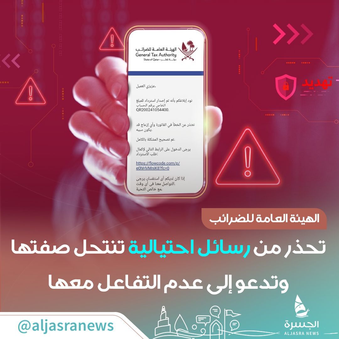 أصدرت الهيئة العامة للضرائب تحذيرا عاجلا للمكلفين وللجمهور العام، تنبه فيه من انتشار رسائل احتيالية مضللة تتضمن روابط إلكترونية مشبوهة، تهدف إلى سرقة البيانات الشخصية والمالية للمستخدمين تحت......