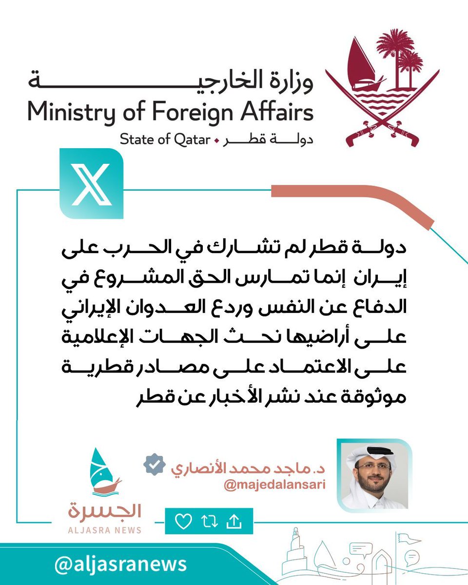 🇶🇦| الدكتور @majedalansari مستشار رئيس مجلس الوزراء المتحدث الرسمي باسم وزارة الخارجية ينفي ما يتم تداوله إعلاميًا حول مشاركة دولة قطر في الحرب على #إيران 📌- دولة قطر تمارس الحق المشروع في الدفاع عن النفس وردع العدوان الإيراني على أراضيها ونحث الجهات الإعلامية على الاعتماد على مصادر قطرية موثوقة عند نشر الأخبار | #الخليج - #IranWar | #الرياض_الان - #Iran