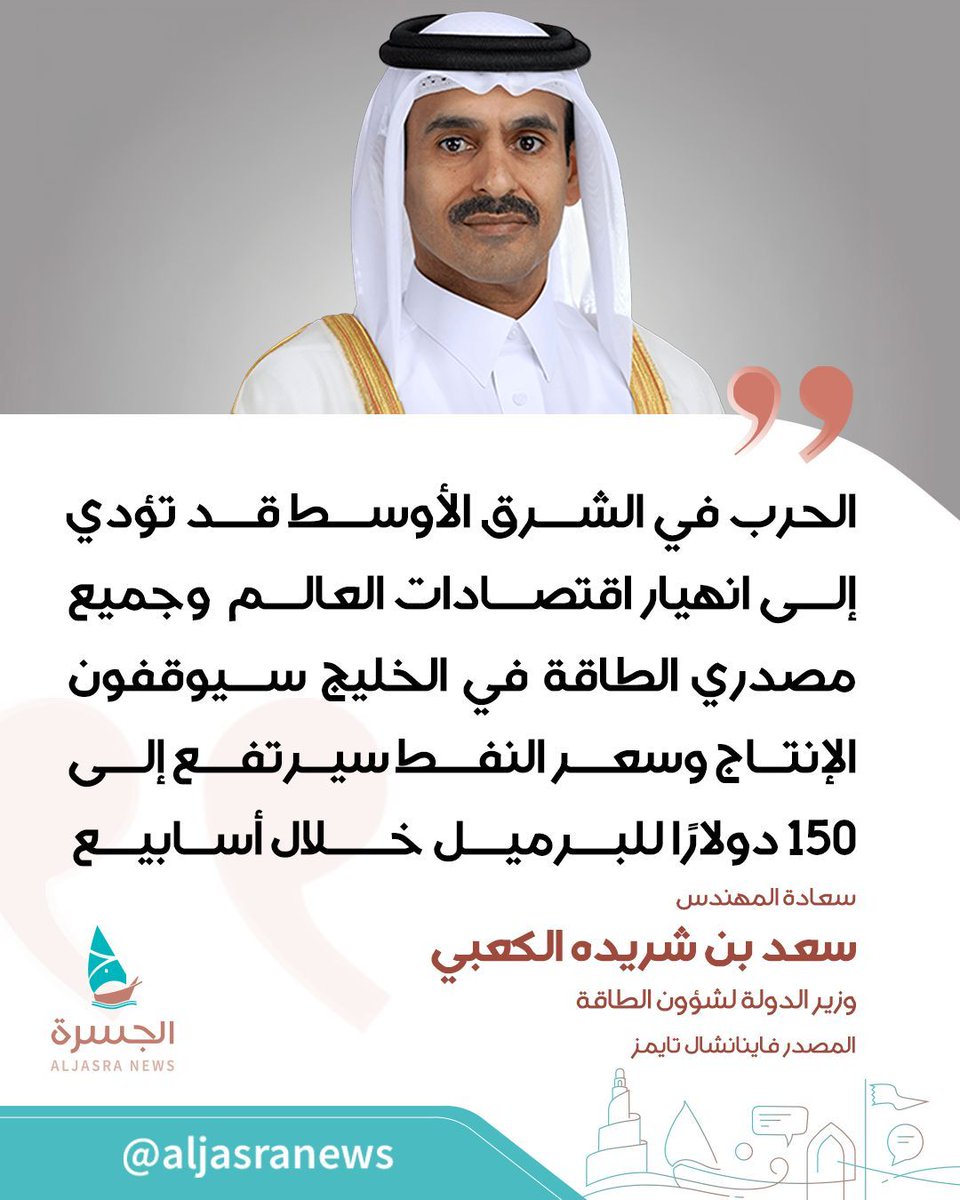 🛢️📈| سعادة المهندس سعد بن شريده الكعبي وزير الدولة لشؤون الطاقة يكشف عن أن جميع مصدري الطاقة في الخليج سيوقفون الإنتاج وسعر النفط سيرتفع إلى 150 دولارا للبرميل خلال أسابيع 📌- وقال إن أسعار الغاز قد ترتفع إلى 40 دولارًا لكل مليون وحدة حرارية بريطانية مع حاجة دولة قطر لفترة تصل إلى شهور للعودة للتوريد الطبيعي | المصدر صحيفة فاينانشال تايمز